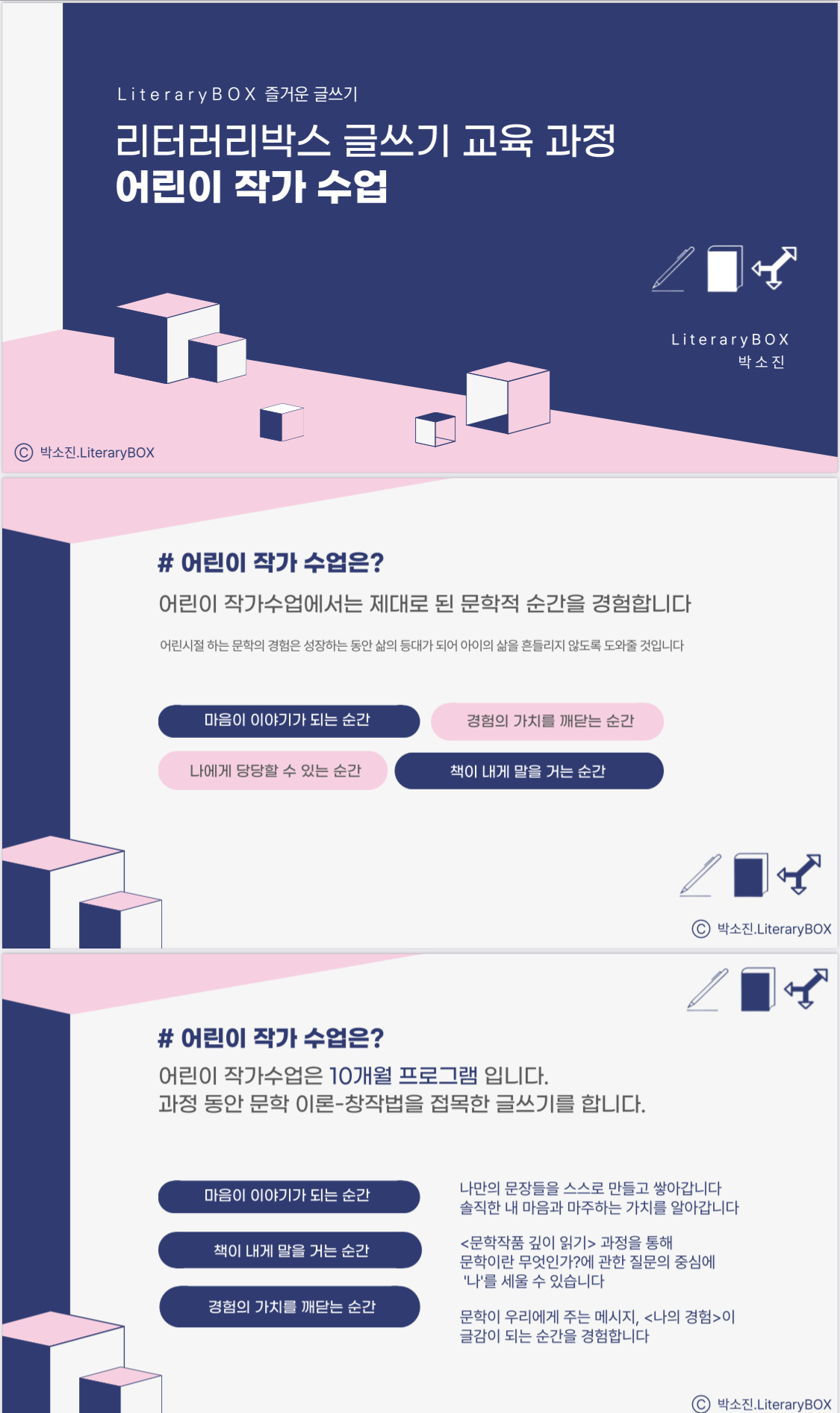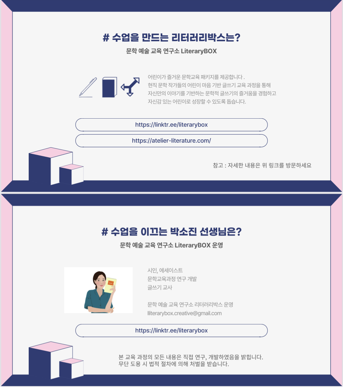리터러리박스 -어린이 문학교육은 전신인 <맘북코칭>, 엄마 독서 코칭으로 부터 시작되었습니다. 부모로서 내 아이가 책을 좋아했으면 하는 고민으로 시작한 “책이랑 친해지기”에 대한 공유 기록이자, 글쓰기 교육, 독서 교육을 소개하고 공유하는 코칭 연구소의 기록의 정체성을 더 튼튼히 묶어 함께 성장하는 글쓰기 연구소 맘북코칭이 정체성 재확립과 더욱 깊은 메시지를 드리기 위해 LiteraryBOX 로 재탄생 되었습니다.