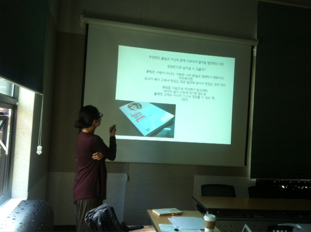 8, 9월 그리고 10월 첫 주까지의 거창한 이름으로 시작한 강의들이 진실로 내면의 자아를 탐색하는 것이었다. 그것이 문학의 목적임을 일깨우기 위한 나의 강의가 이제 조금씩 사람을 변하게 하고 있음을 느낀다. ‘내 안의 자아를 만나 변화된 빛’을 발하는 그녀들(강의 참여자)을 보면 그 뿌듯함과 감동은 말로 표현하기가 벅차다. 날이 지날 수록, 더욱 열심히 참석하는 그네들과 함께 호흡하는 시간이 문학이 흐르는 순간이며 온 자아들이 형태 밖에서 춤추는 공간이다.