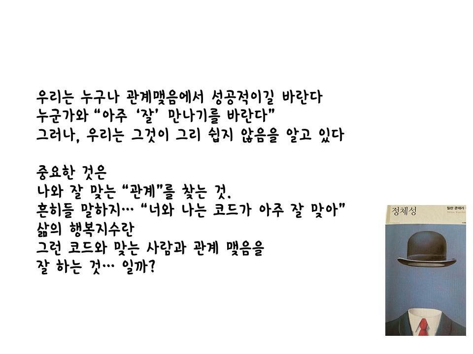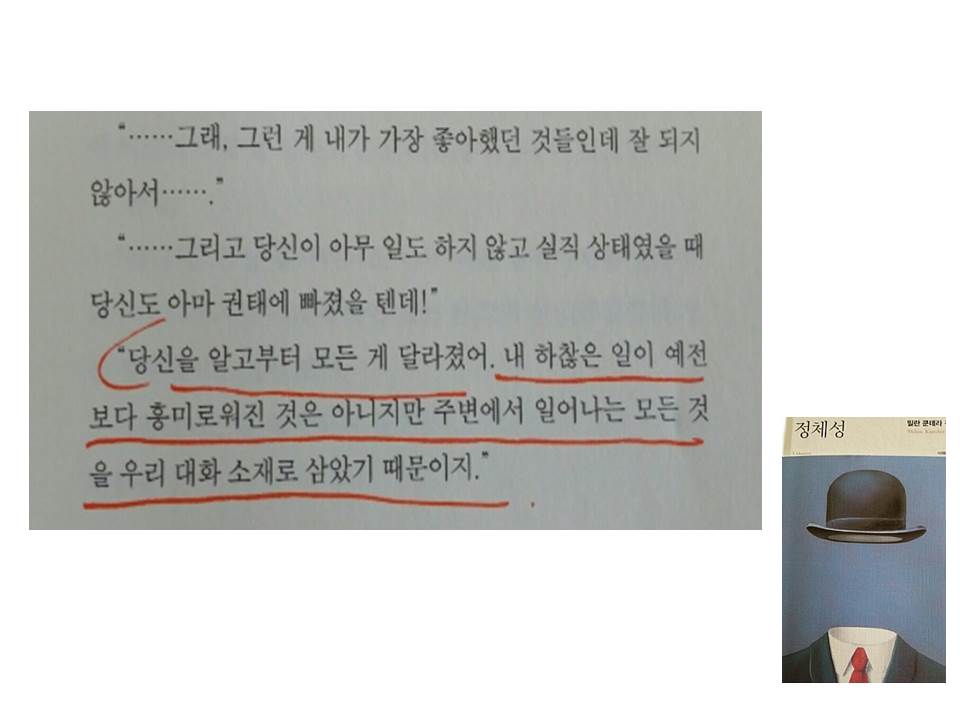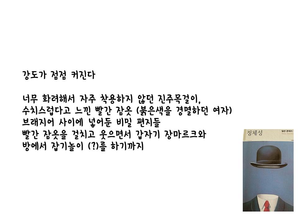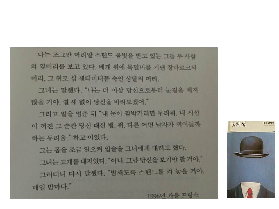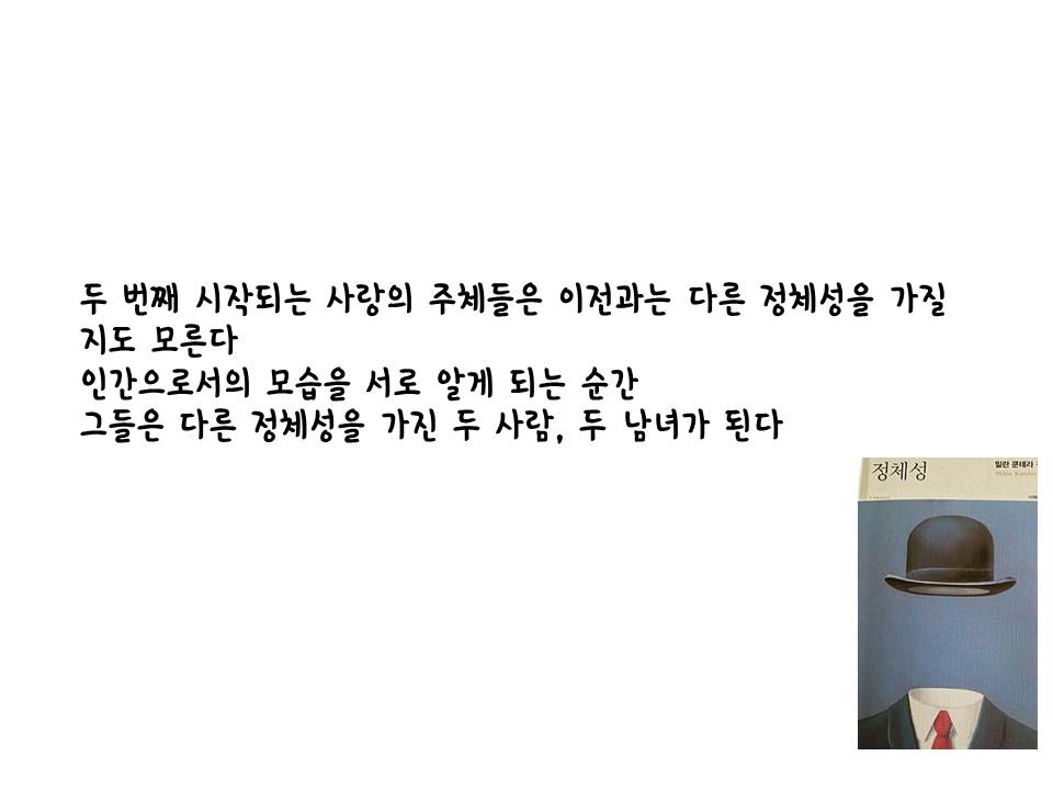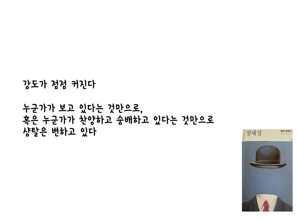 그래서 나는 독자수용이론을 건드린다. 어떤 관점으로 바라보는가, 방점을 어디에 찍을 것인가? 그것이 하나의 정체성이라면 타인의 그것은 또 다를 수 있고, 한번에 여러개의 방점도 찍어볼 수도 있다. 무엇을 해도, 즉 어떠한 아이덴티티로 <정체성>을 읽는다한들, 그것은 샹탈과 마르크스가 마지막 심적자유의 상태에서 서로의 밑바닥까지 들여다본 정체성들의 갈구처럼, 독자의 자유로운 정체성은 분명 밀란 쿤데라와의 교감을 이룰 것이기 때문이다.
