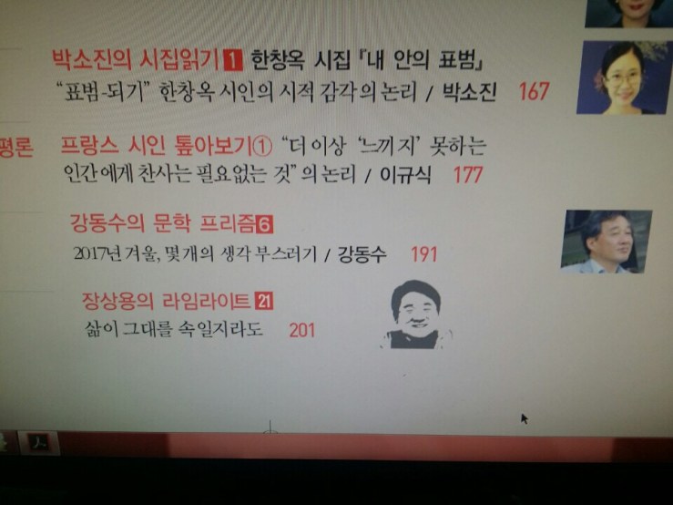 Poetry Review (2017 series 1/4) by Park Sojin Posted on 3월 9, 20173월 26, 2017 by atelier-literature spring, 2017 (2017년 봄호 ) poem magazine <PoemPoem> reviewed Han Chang Ok’s poetry 이 글 공유하기: 페이스북에 공유하려면 클릭하세요. (새 창에서 열림) Facebook 클릭하여 친구에게 이메일로 링크 보내기 (새 창에서 열림) 전자우편 좋아하기 가져오는 중... 글쓴이: atelier-literature atelier-literature의 모든 글 보기